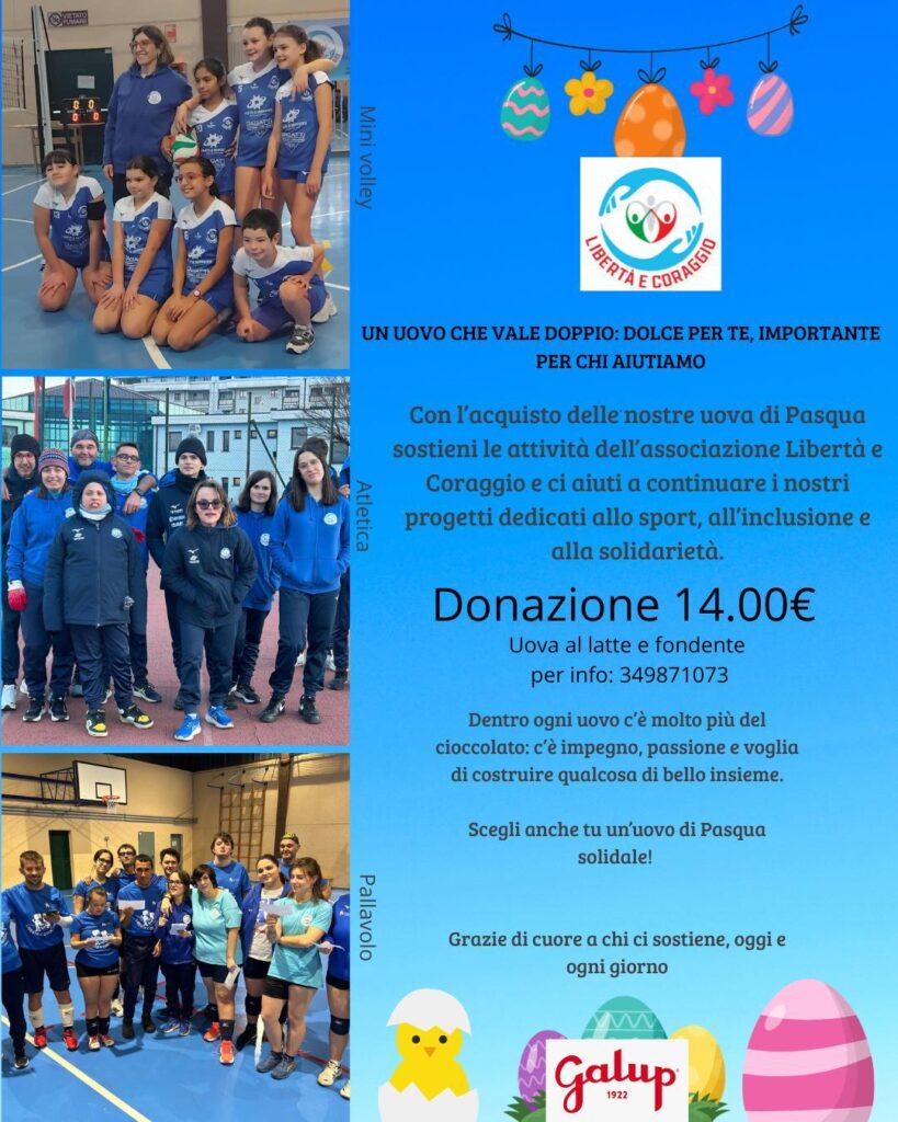 Si comunica che nelle giornate di mercoledì 25 febbraio e lunedì 9 marzo sarà possibile acquistare, nella zona antistante la Sala Congressi, delle uova di Pasqua Galup per sostenere l’associazione “Libertà e Coraggio”, che si occupa di attività sportive con ragazzi con disabilità.